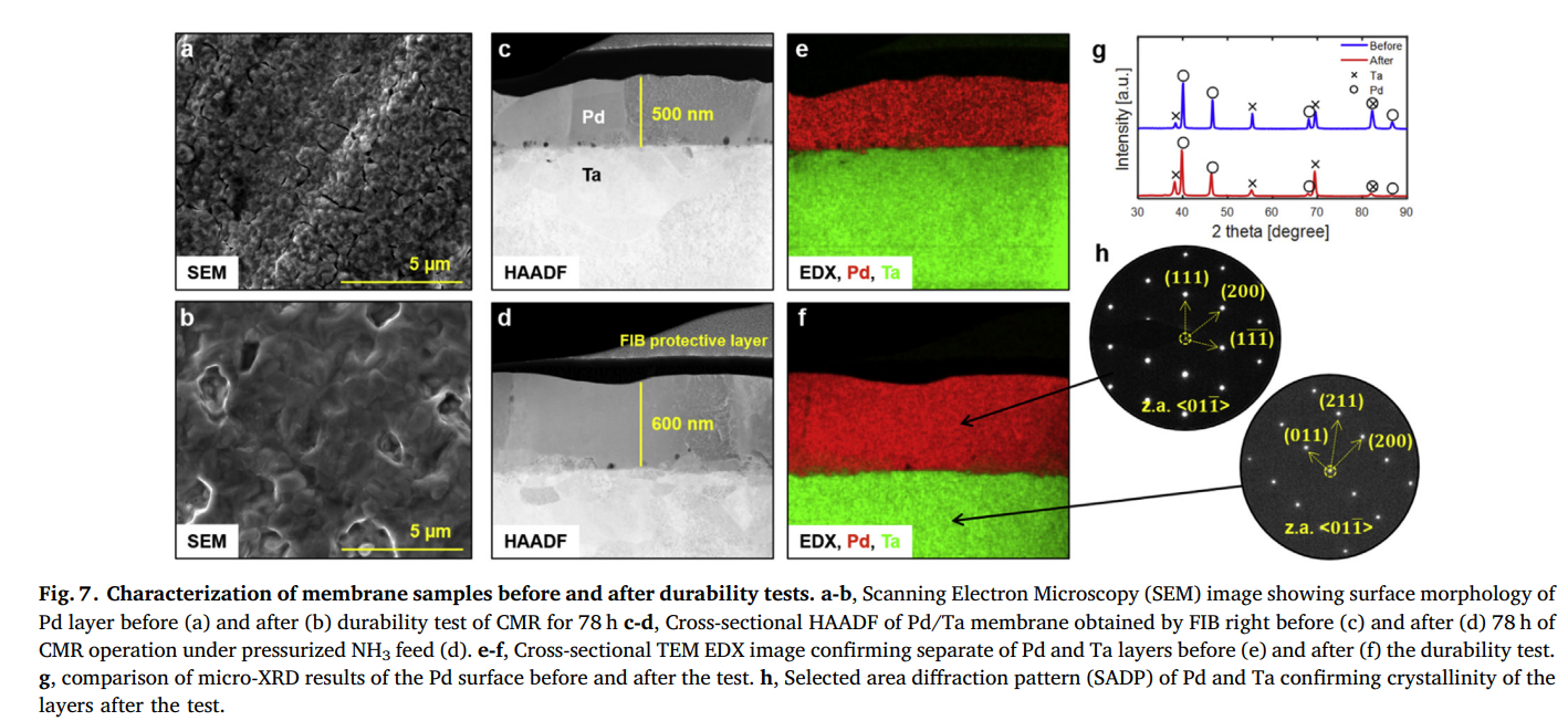 → Pd(~0.4$\mu m$)/Ta(~250$\mu m$) membrane 개발 (group V body-centered-cubic BCC metals with a thin catalytic Pd layer ≤ $1\mu m$) & Ru/La - Al2O3 pellet catalyst를 사용: 수소 투과율이 5배 증가